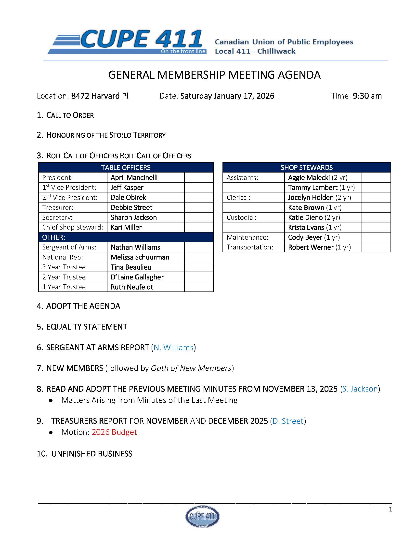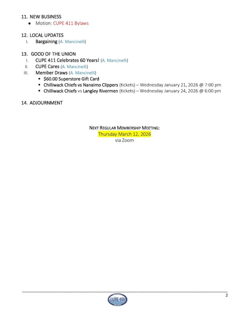 General Membership Meeting Agenda – January 17, 2026
