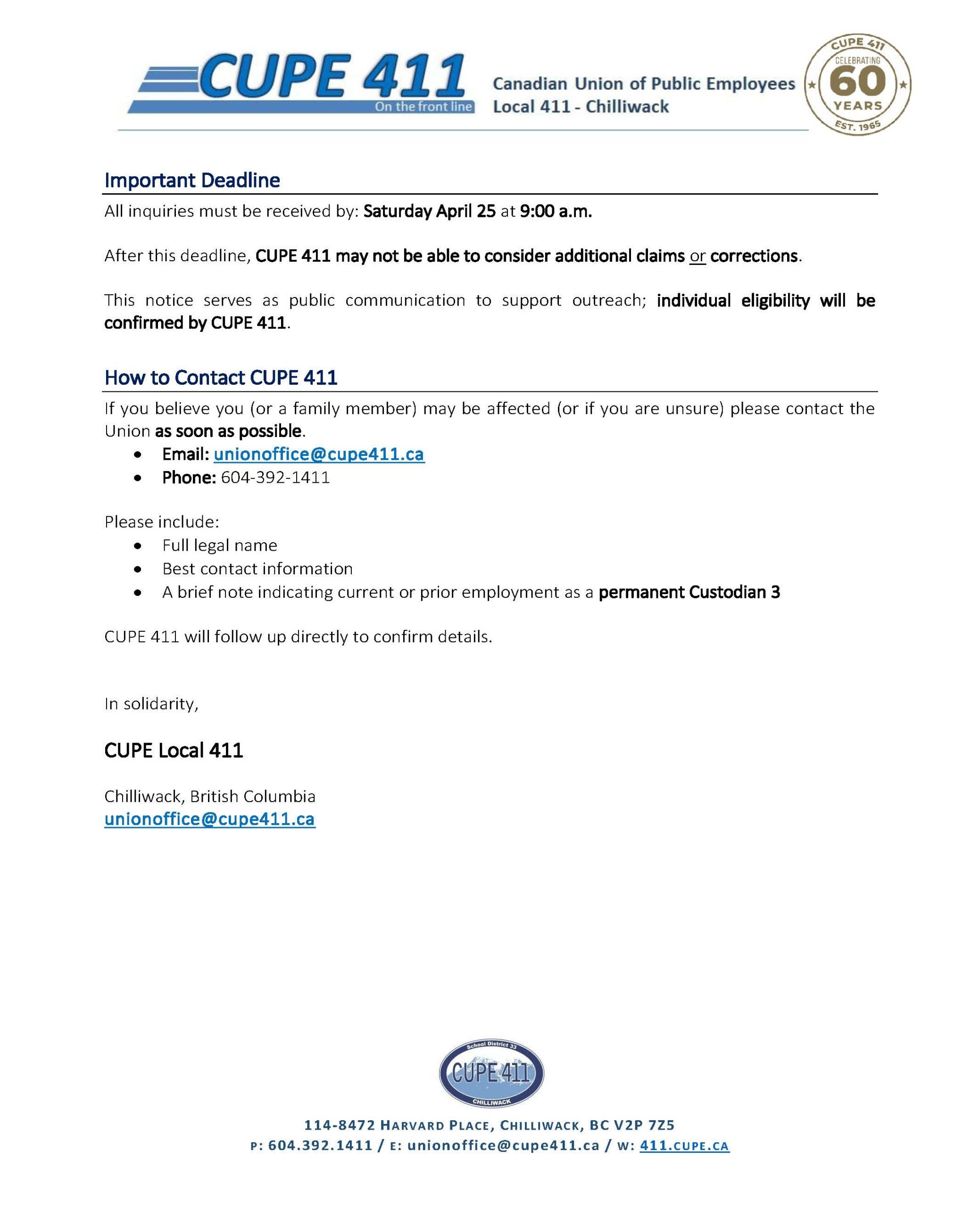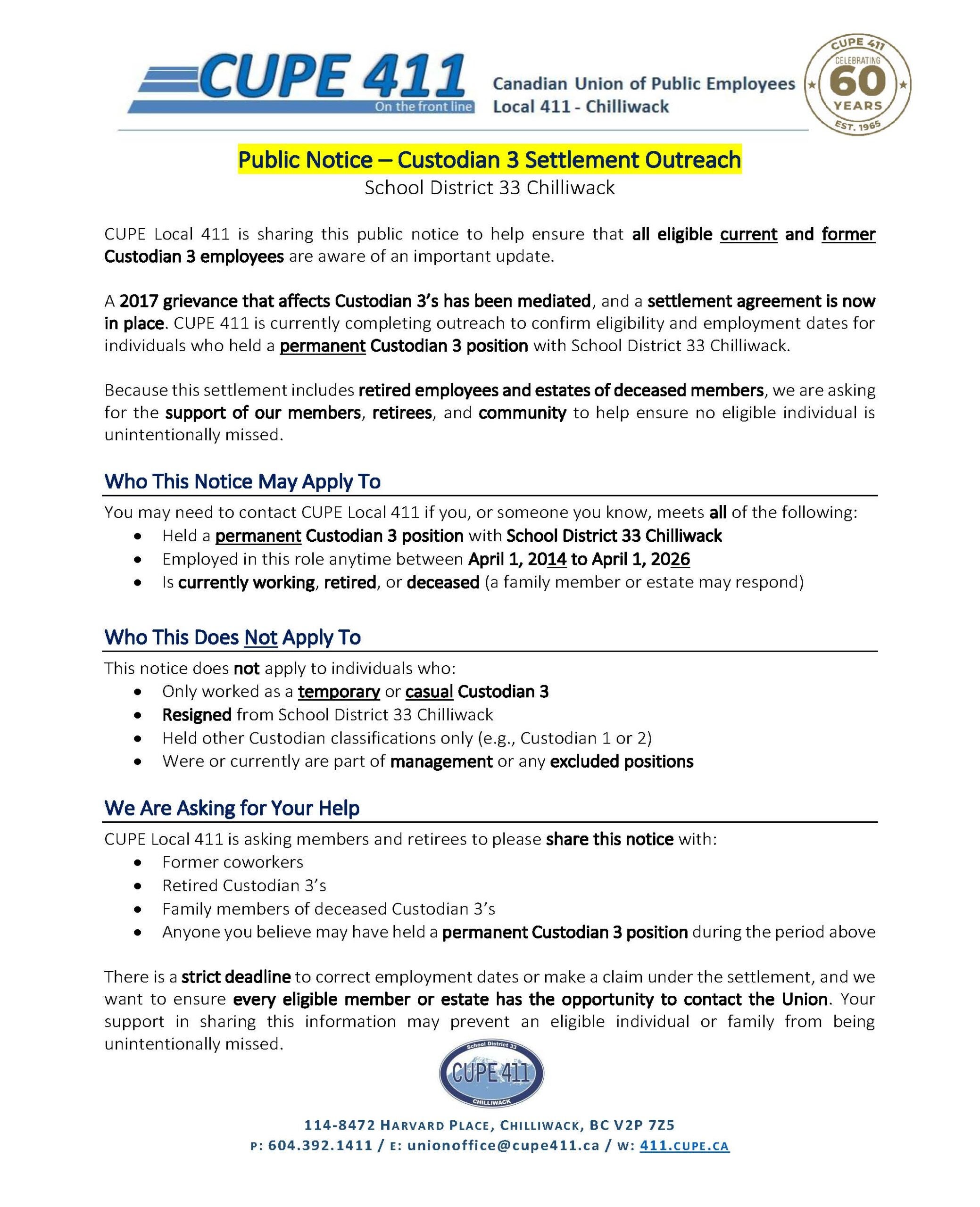 CUPE 411 – School District #33, Chilliwack